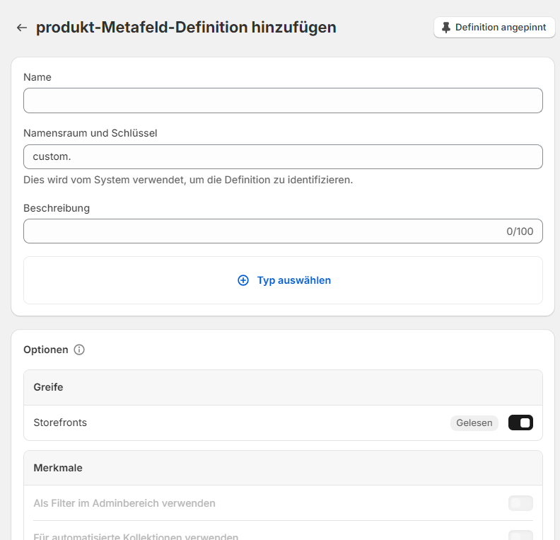 Du kannst jede Metafeld-Definition anpinnen oder loslösen. Wenn du sie anpinnst, dann wird sie an der entsprechenden Stelle direkt angezeigt. Du kannst pro Metafeld-Bereich (also zum Beispiel Produkte, Varianten, Blogs etc.) jeweils maximal 20 Definitionen anpinnen.